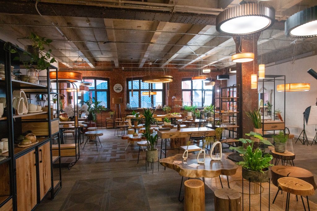 Concepto tipo loft. Mesas y sillas altas para un mayor dinamismo